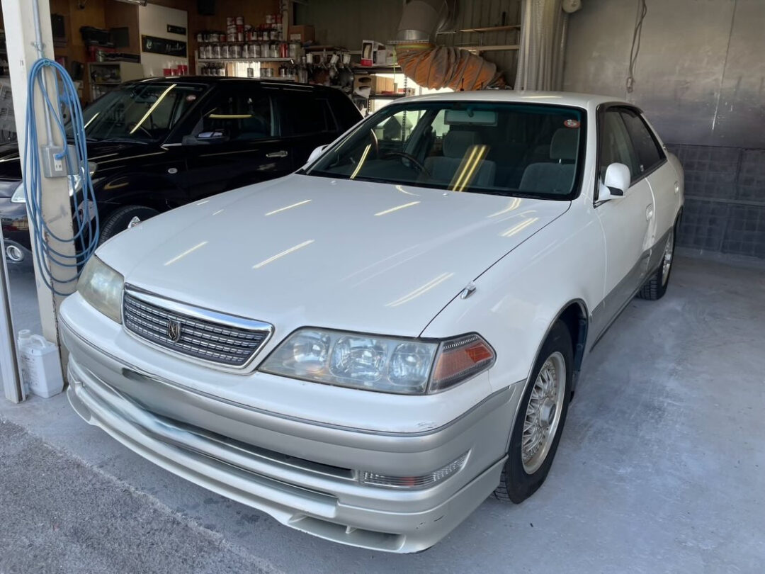 Now then, today I’d like to introduce a Toyota Mark II from a repeat customer ️ This vehicle was involved in an accident while parked, with the fault being 100% on the other party. The repair was covered by the other party's insurance, but since some parts had been discontinued again, we made sure to complete the repair properly using recycled parts ✨ The repair involved replacing the left side door and turned out to be fairly expensive, but with the current value of the 100 series being around 3 million yen, that's a relief